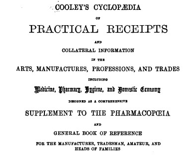 The " Cyclopedia of Practical Receipts" as well as COOLEY'S CYCLOPEDIA IN 2 VOLUMES being now completed is to offer to the reader a few preliminary remarks concerning the nature and contents of the work to which his attention is directed. " The design of this work is to present an accurate and compendious collection of formulas and processes with a variety of information suitable to the general reader and practical purposes."